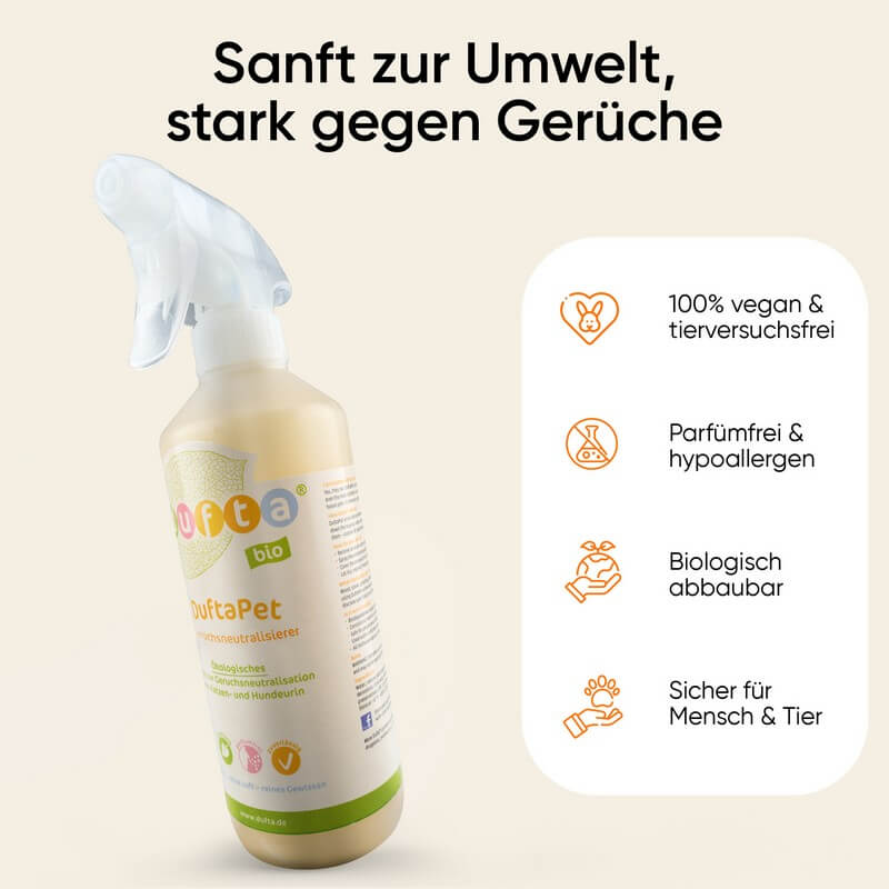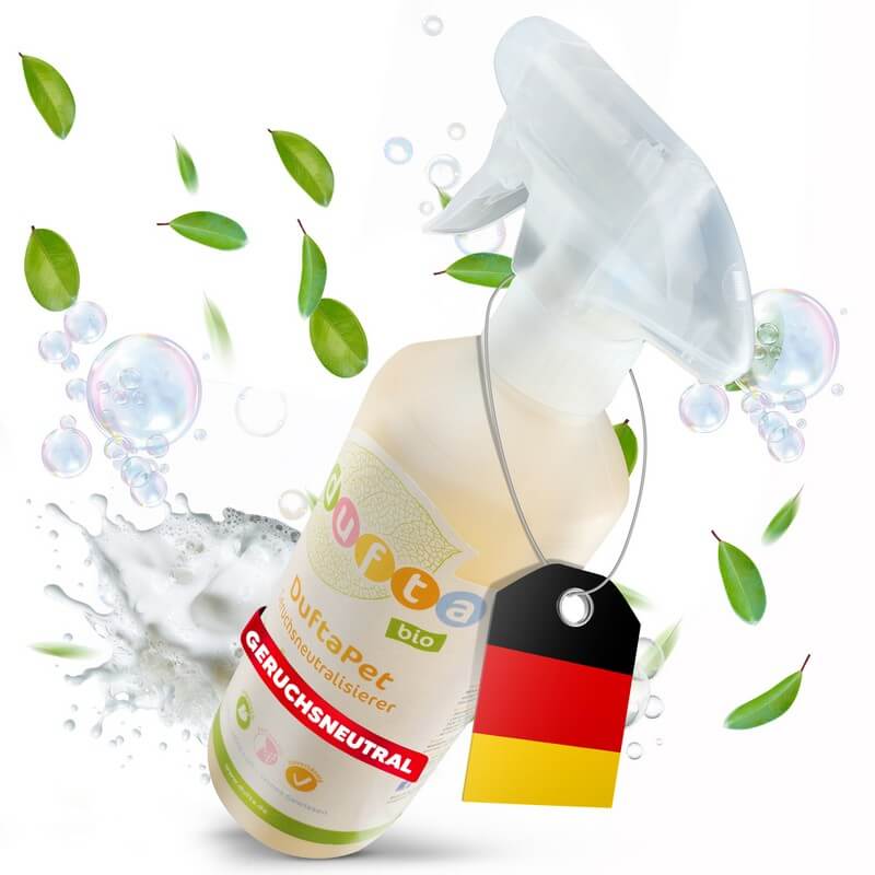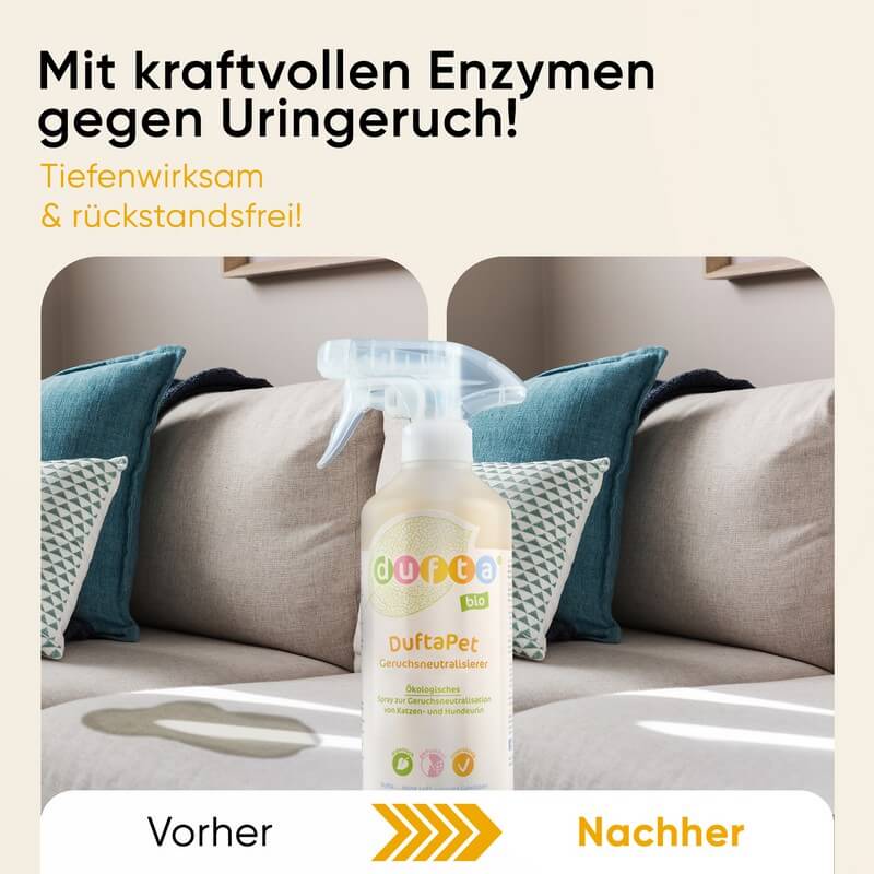 Die in DuftaPet Geruchsneutralisierer enthaltenen pflanzlichen Enzyme brechen die organischen Geruchsmoleküle auf und beseitigen diese vollständig – statt sie nur zu überdecken.
