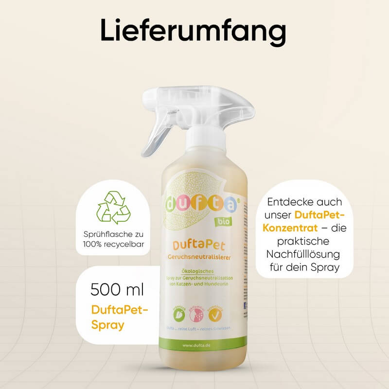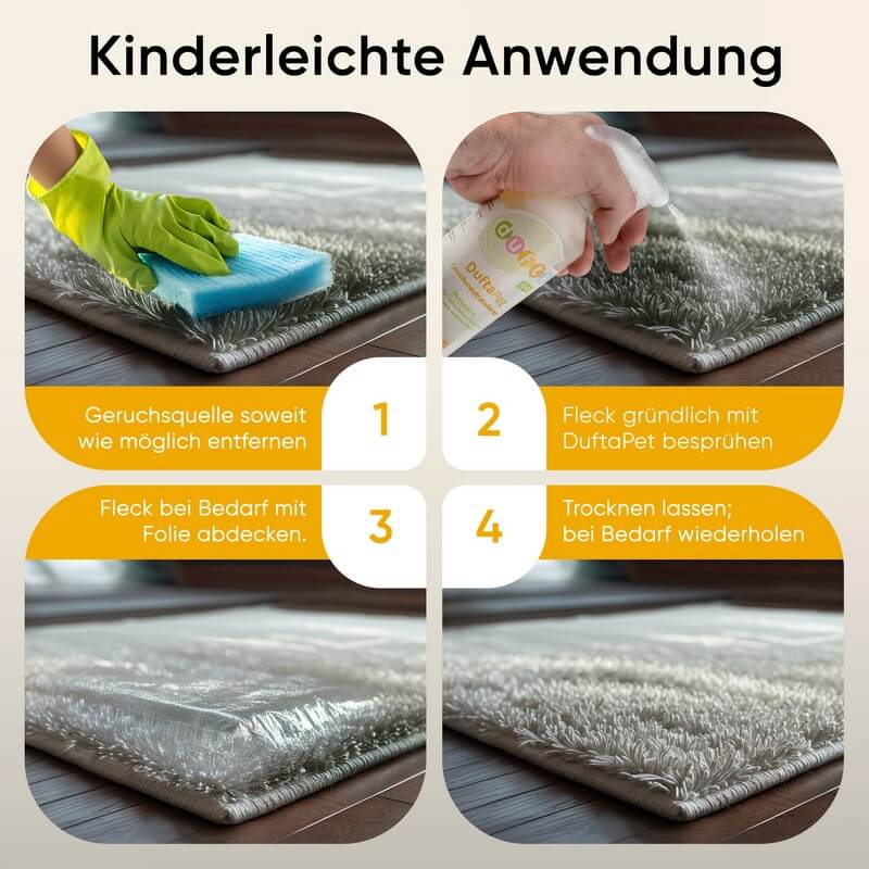 - Fleck vollständig mit DuftaPet Geruchsneutralisierer besprühen