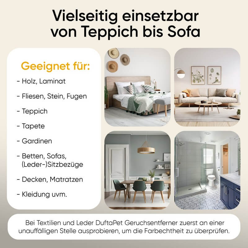 Bei Textilien und Leder DuftaPet Geruchsneutralisierer zuerst an einer unauffälligen Stelle ausprobieren, um die Farbechtheit zu überprüfen.
